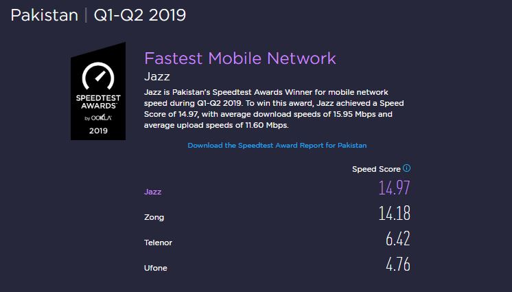 جاز پہلے ہی پاکستان کا تیز ترین موبائل نیٹ ورک ہے، جسے اوکلانے اپنے اسپیڈ ٹیسٹ ایوارڈ کے ذریعہ تصدیق کی۔جاز نے یہ ایوارڈ مسلسل تین بار جیتا ہے۔ ان نتائج کا اعلان اوکلا نے پاکستان کے تمام بڑے موبائل آپریٹرز کے اسپیڈٹیسٹ کو موازنہ کرنے کے بعد کیا۔ جاز عوام کو بہتر سلہولت کی فراہمی کے لئے ماحولیاتی نظام کی ترقی کے نفاذ کی بھی نمائندگی کر رہا ہے۔