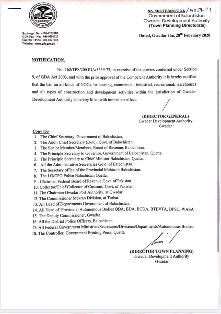 ڈائریکٹر جنرل گوادر ڈیولپمنٹ اتھارٹی کی جانب سے جاری کردہ نوٹی فیکیشن کی نقول تمام متعلقہ اداروں کو ارسال کردی گئی ہیں۔