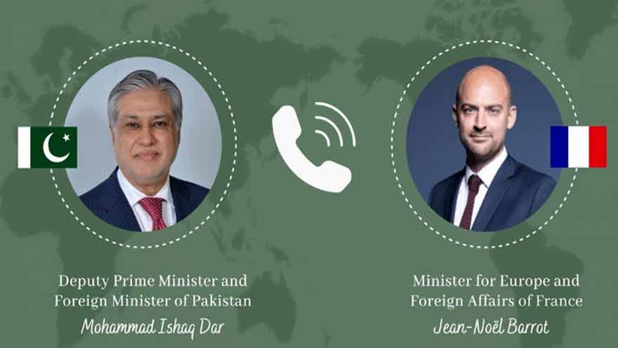 نائب وزیراعظم اور وزیر خارجہ اسحاق ڈار اور فرانس کے وزیر خارجہ جین نوئل باروٹ کے درمیان ٹیلی فونک رابطہ ہوا ہے۔ گفتگو کے دوران دونوں رہنماؤں نے خطے میں قیام امن اور استحکام کے لیے جاری سفارتی کوششوں پر تبادلہ خیال کیا۔