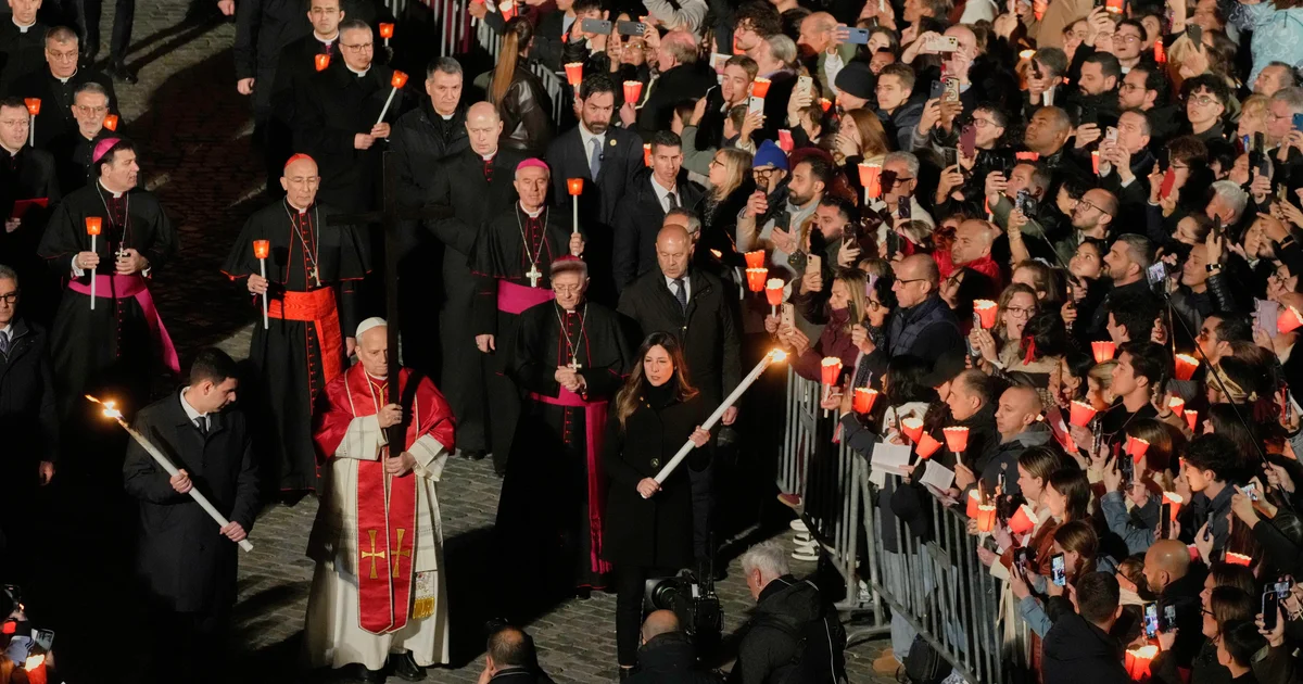 تقریب کے دوران پوپ لیو نے دو مشعل برداروں کے ہمراہ کولوزیم کے اندر سے سفر کا آغاز کیا، جو ایک گھنٹے تک جاری رہنے والے اس جلوس میں ان کے ساتھ رہے۔ یہ جلوس کولوزیم سے باہر ہجوم کے درمیان سے گزرتا ہوا پیلاٹائن ہل کی اونچی سیڑھیوں تک پہنچا، جہاں پوپ نے حتمی دعا کروائی۔